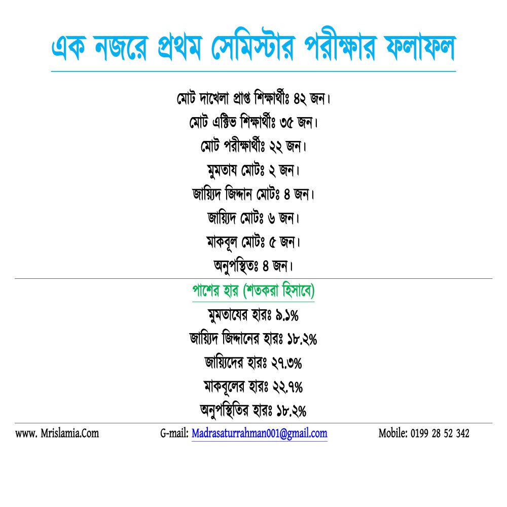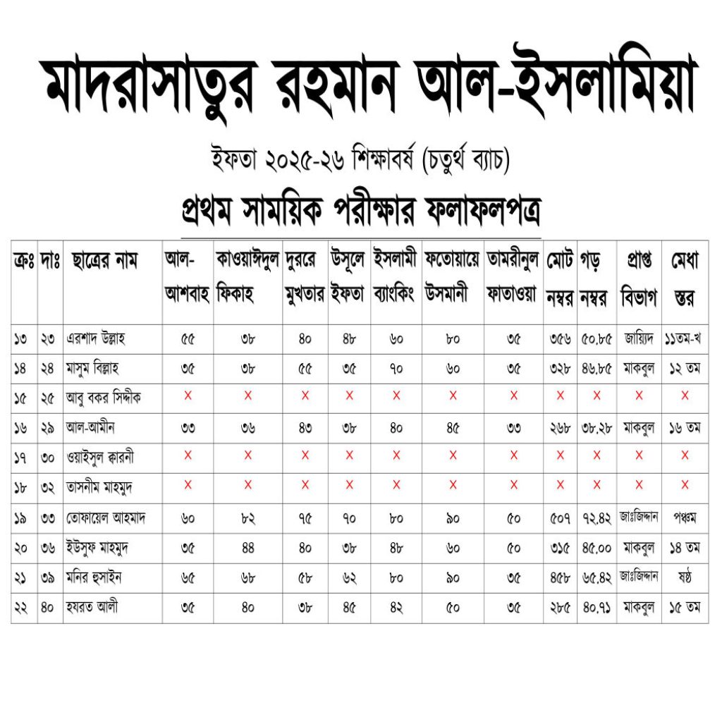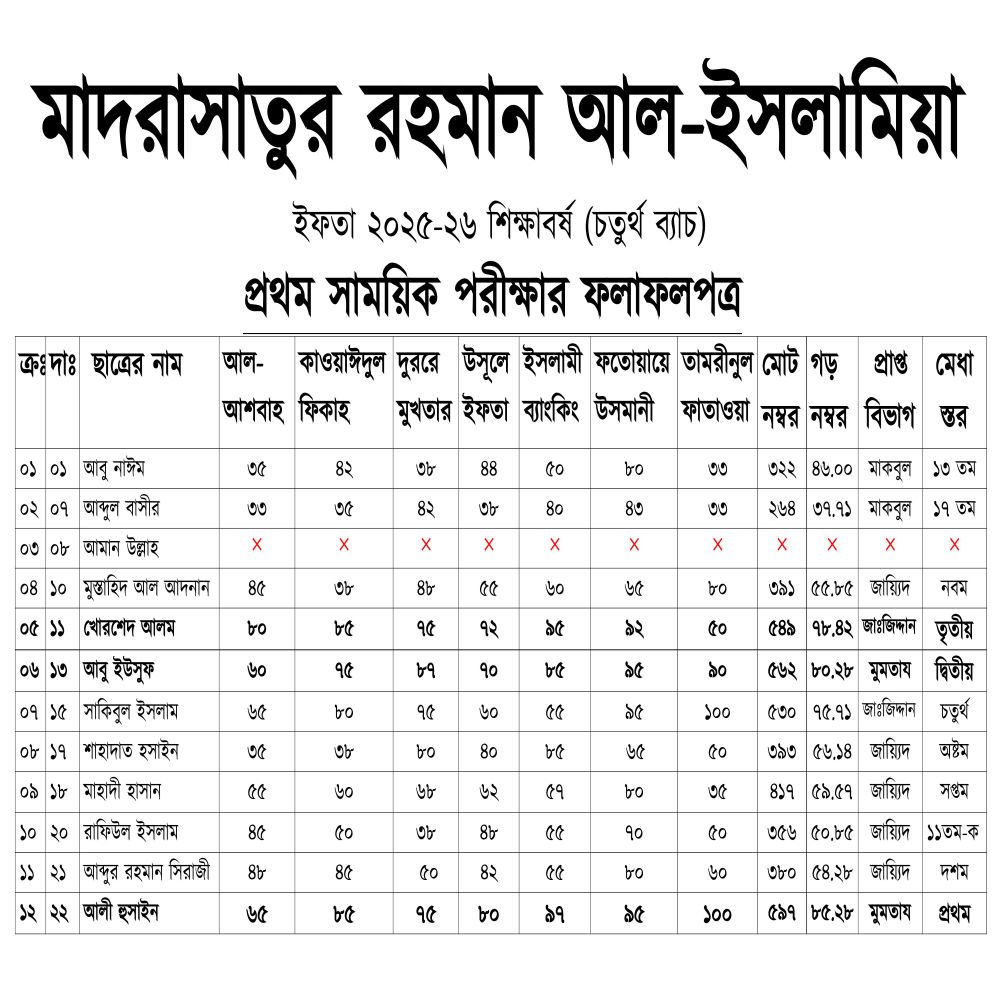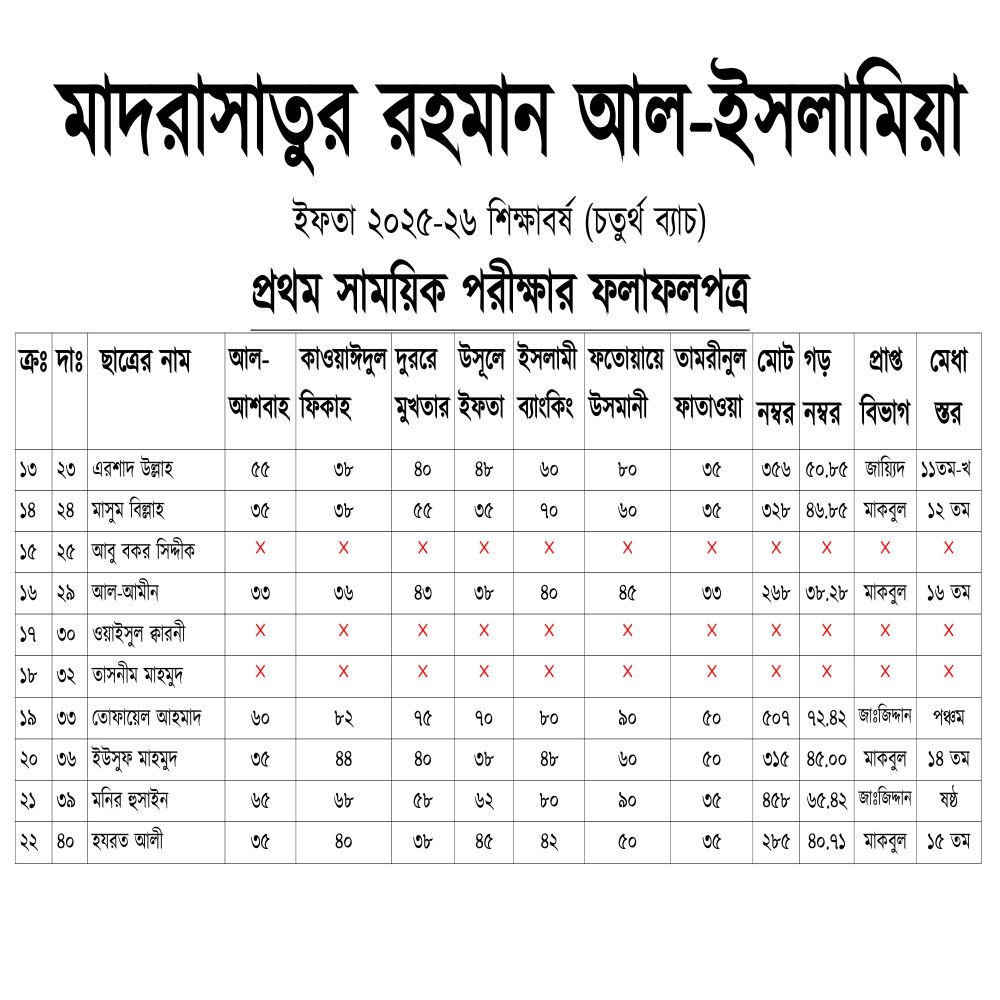 ইফতা ২৫-২৬ শিক্ষাবর্ষঃ ১ ম পরীক্ষার ফলাফলপত্রইফতা ২৫-২৬ শিক্ষাবর্ষঃ ১ ম পরীক্ষার ফলাফলপত্র By @Mrislamia10 | September 24, 2025 | Result | 0 Comments | Tags: ২০২৪-২৫ শিক্ষাবর্ষের বার্ষিক অনুষ্ঠান কার্যক্রম বিবরণী, ইফতা ২২-২৩ শিক্ষাবর্ষঃ বার্ষিক পরীক্ষার ফলাফল, ইফতা ২৪-২৫ শিক্ষাবর্ষঃ ১ ম পরীক্ষার ফলাফলপত্র